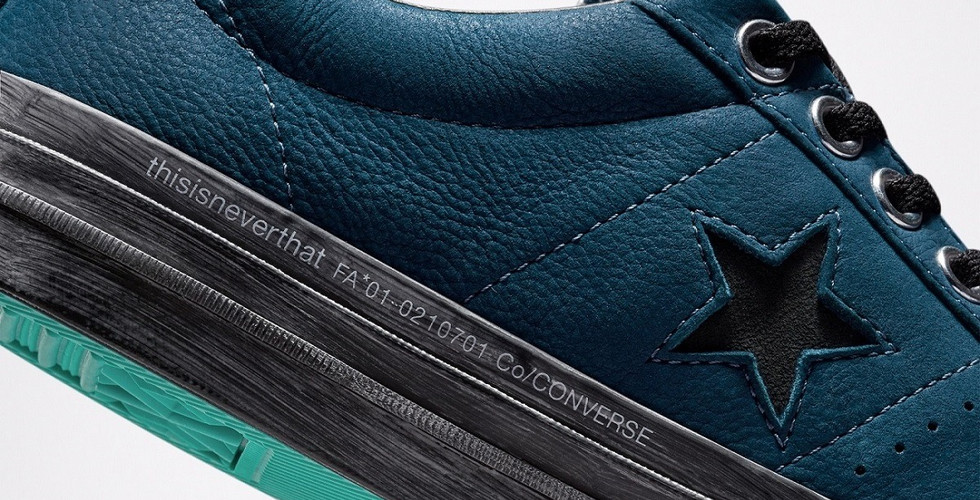 本次合作系列在 One Star 鞋款中可以看見復古藍牛巴革材質鞋面和鮮綠色的大底碰撞出別致新鮮感,突出 One Star 經典鞋頭擋泥板細節的同時,中底部分亦呈現出褪色老化的處理效果,大底圍條設計凸顯復古氛圍。同時鞋帶頭均印有 Converse 和 thisisneverthat 的標識。