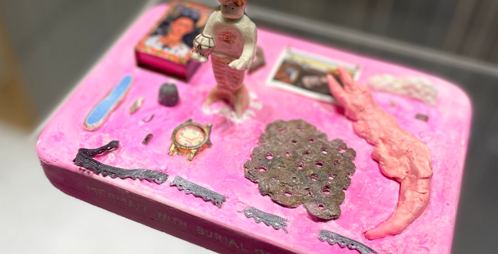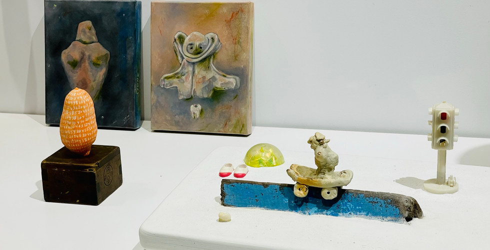 我家的櫃子裡也藏了好幾個舊餅乾盒,盒子收藏著我與某人交往過程中的物件,裡面有信件、玩具、牙刷、齒模、 手寫歌詞的燒製CD,有紀念徽章、票根、海邊撿的貝殼、已經打不開任何門的鑰匙,還有屬於每個盒子不同的氣味。隨著年紀增長,鐵盒越來越小,從前什麼東西都得裝進去,現在雲端上一個按鍵便能將回憶刪除的煙飛雲散, 所以我還是好好收著這些舊餅乾盒。鐵盒中蒐藏的物件像是每個階段的自己,有著不同的個性與質地,我把物件用陶瓷手捏複製後,加上複合媒材製成雕塑,畫作則是用我刷房間牆面剩下的油漆畫的,兩個物件擺在一起就成為一個隱喻、一個故事,關於女孩和男孩長大成自己的故事。